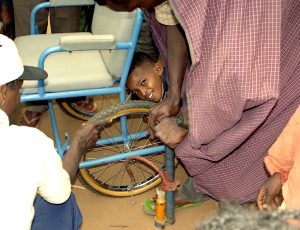 The first man picks up his friend again and steps toward the crowd surrounding the wheelchair. The last bolt has just been tightened and the wrench set aside. The crowd parts, and the two friends move into the inner circle. The polio survivor is placed in the wheelchair and everyone cheers. The celebrity of the moment just grins like it’s the best day of his life. There are no speeches, no fanfare—no one signs for the delivery. Someone starts to push the chair, and the crowd parts again. I take pictures as the man moves back across the field in the direction from whence he came, on a different set of wheels.