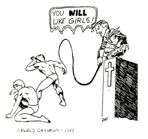 But Colin Cook bought into the social stigma from the start—always hated himself as a gay man, and assumed every other gay person did too. (Read his book.) He never knew love, never had a single gay friendship. The only sexual activity he knew was in the backs of porno theaters. Although this is as foreign to gay people as it would be to heterosexuals, Cook defined homosexuality by his own pathological notions and behaviors. He told his counselees that to be healthy, they had to give up their entire sexuality itself—their homosexuality—and then if they tried hard enough and long enough, maybe they could attempt to regain some semblance of sexuality by learning to find eroticism in what naturally repulsed them.