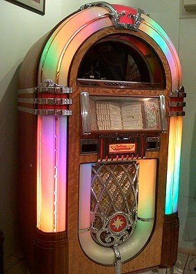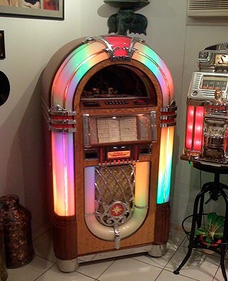 I need to part with this box for several reasons. Mainly, I badly need a treadmill (I’m an early baby boomer, if you catch my drift) and there’s really no other place to put my new exercise equipment. Plus my decor could use a new focus; it’s time for me to pass this particular nostalgia on to someone just getting into it. If you want a touch of quaint nostalgia for your home, just be sure you go with one that plays 45s. CDs are so much a thing of the past that, since 2006 already, Rock-Ola/Antique Apparatus has been manufacturing the same bubble-style reproduction without any mechanics at all—no CDs or records. All the music plays from a hard drive, and all you see is a screen; you can stand there and read the singer’s biography, but you can’t watch anything happen. What fun is that? Your perfect choice in a jukebox is the one I have!